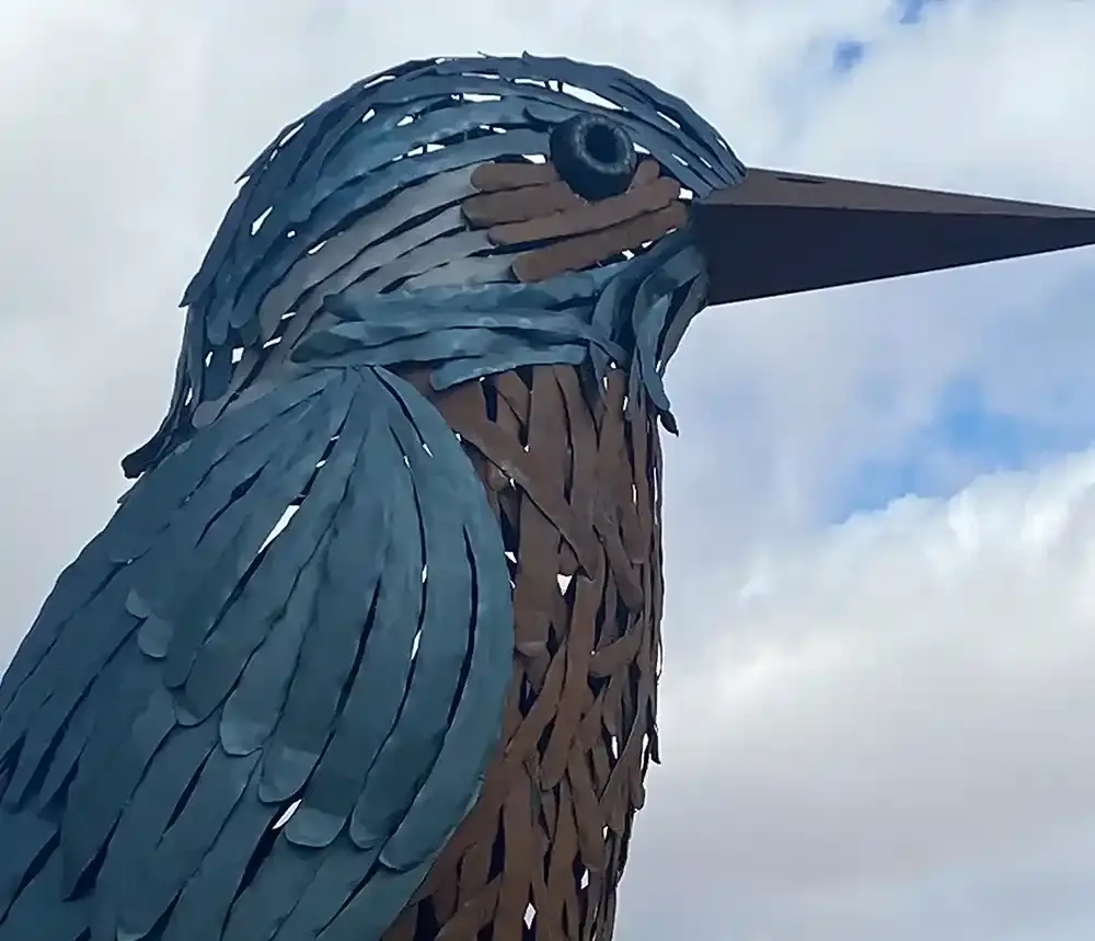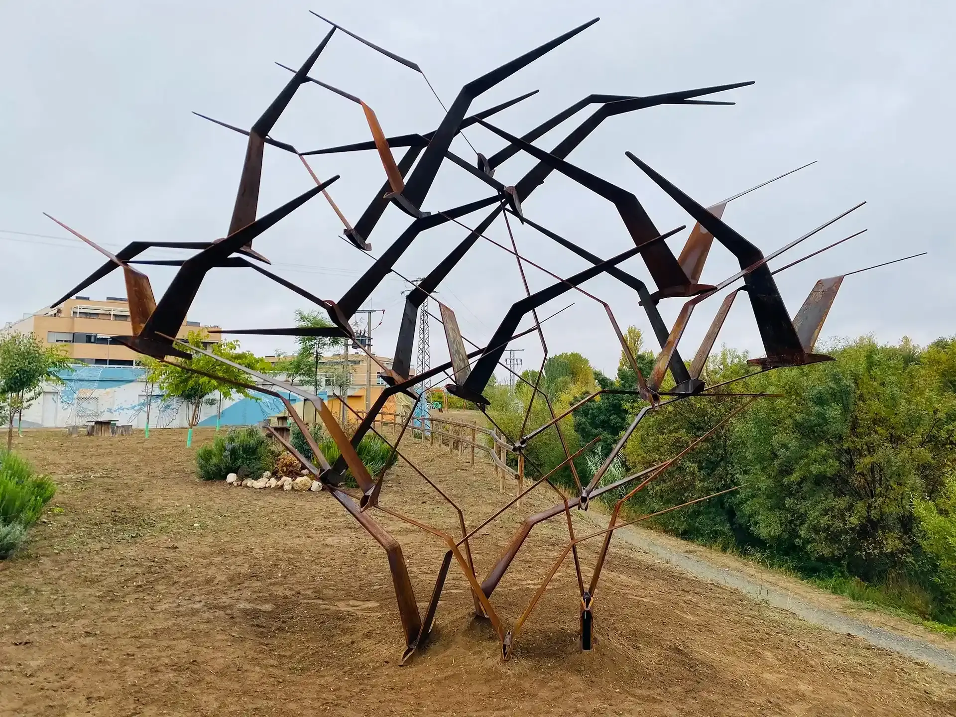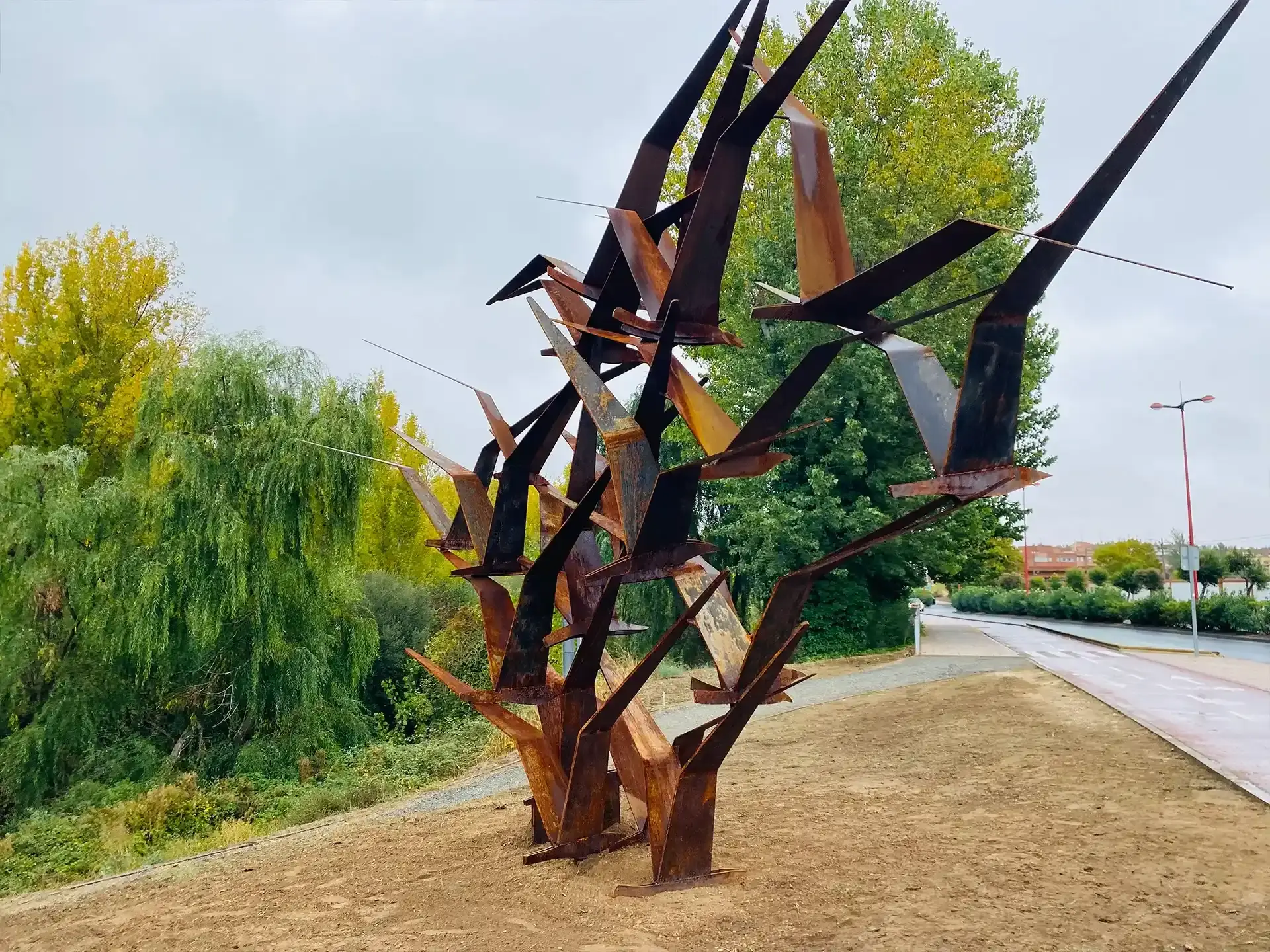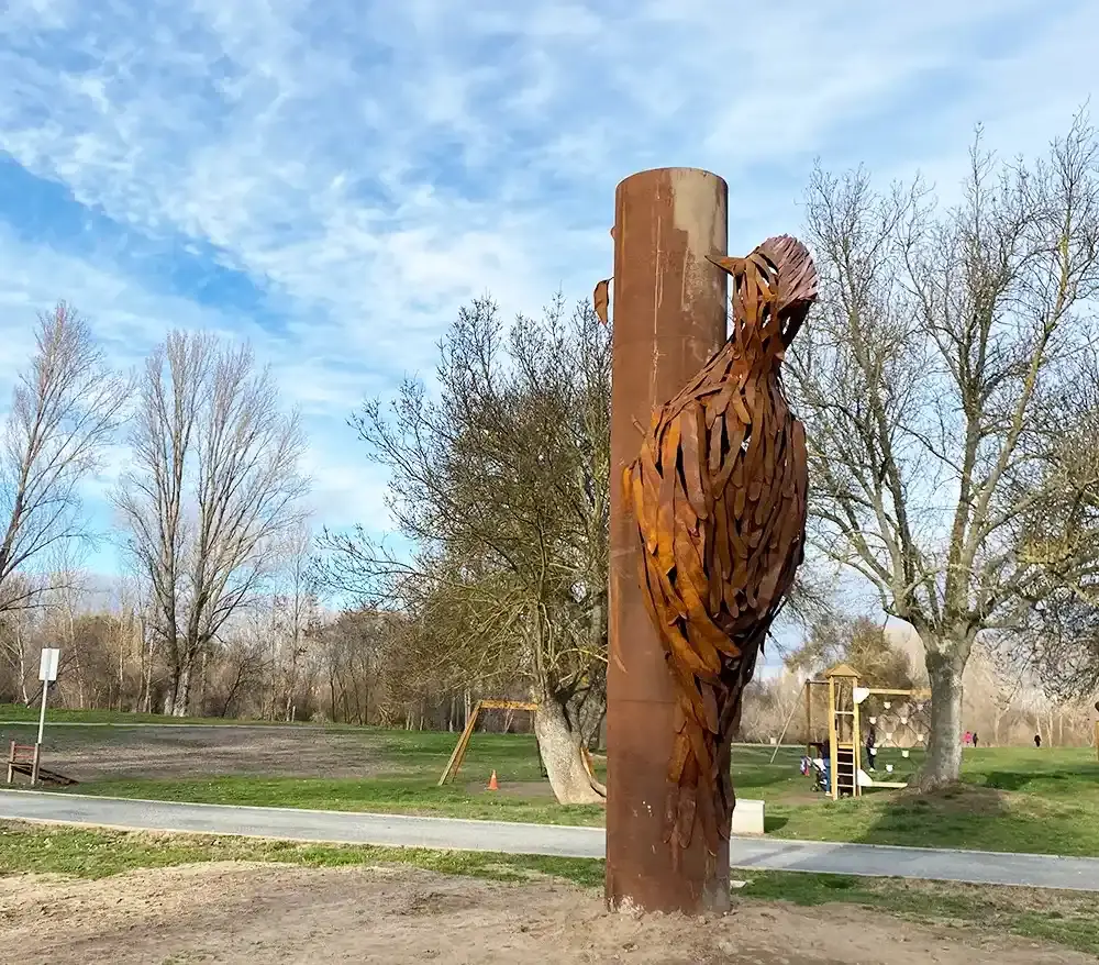 Como broche final a la "Ruta de los Puentes del Arte", en la Avenida de Madrid, se sitúa "Bandada". Esta imponente pieza de hierro oxidado, de seis metros de alto por siete de ancho, captura el instante preciso en que 21 aves emprenden el vuelo, simbolizando la libertad y la protección del entorno natural.