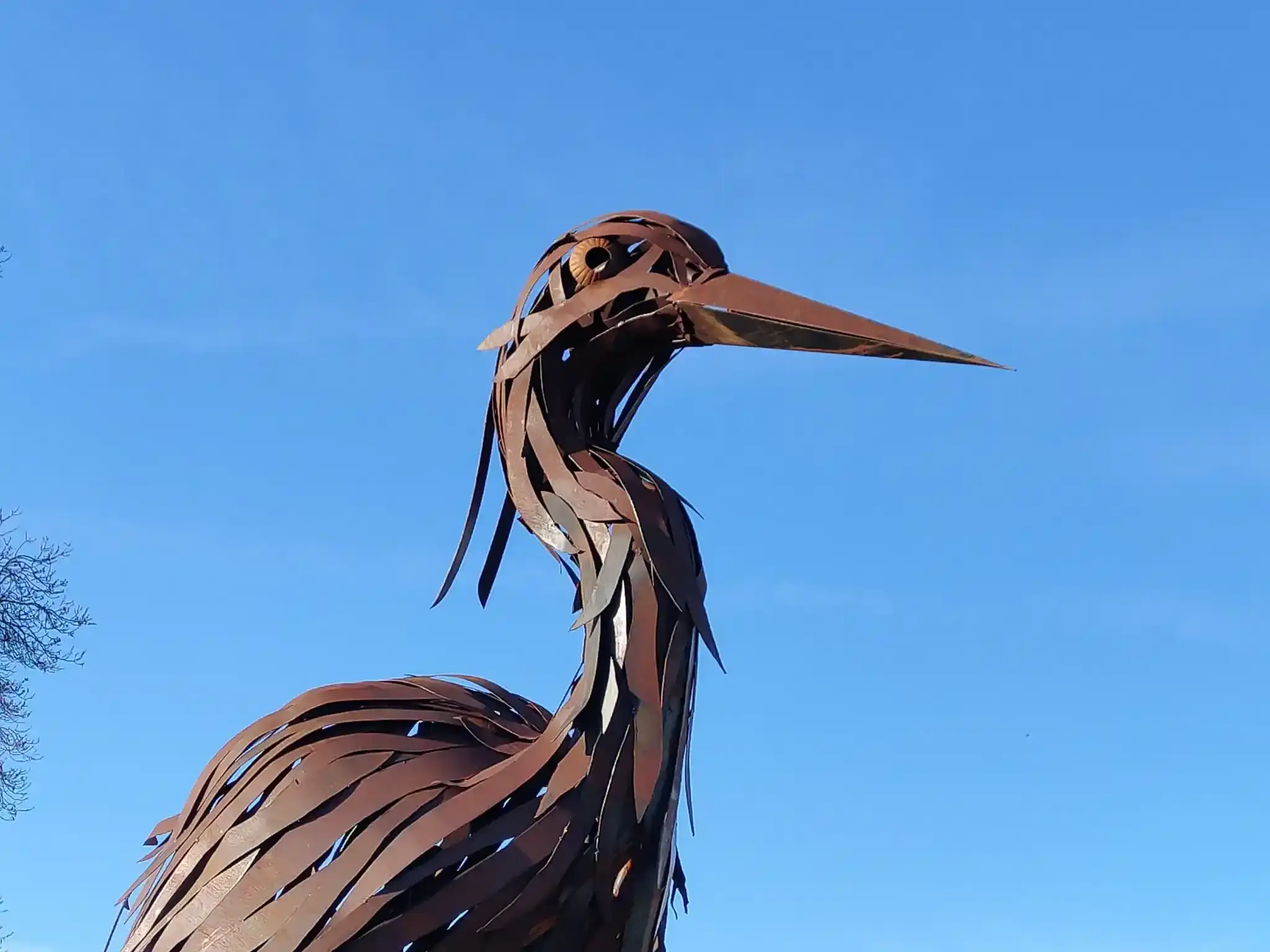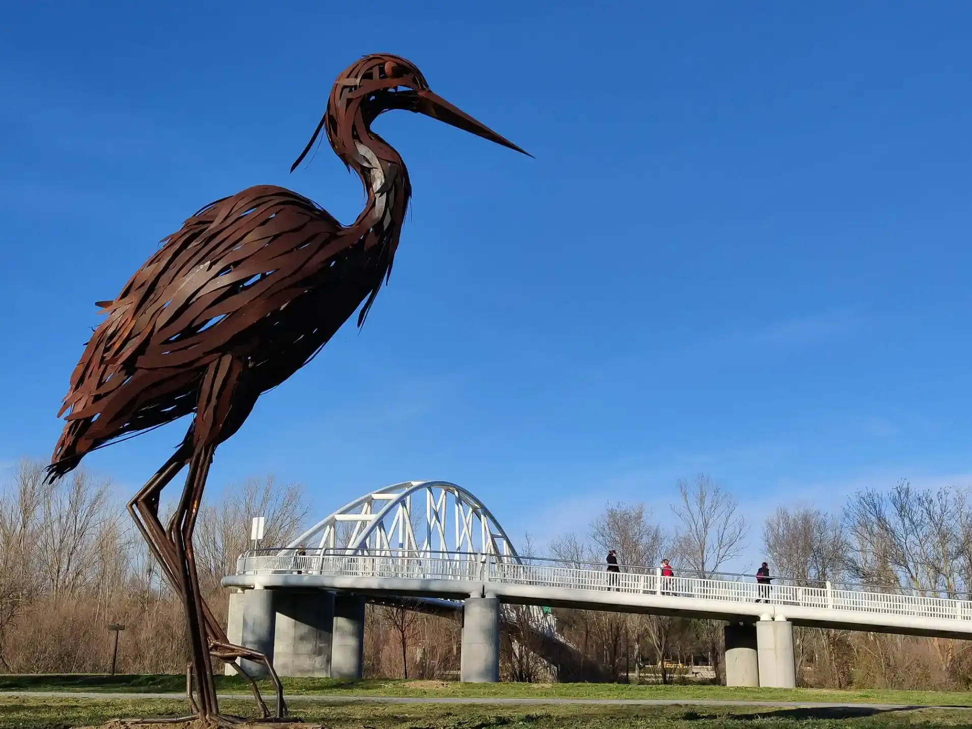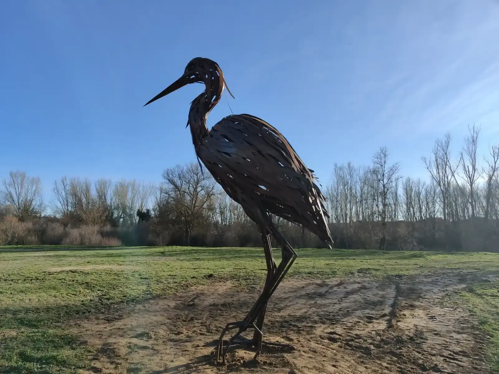 La elegancia de la ribera: Cerca de la pasarela que conecta con la zona de La Aldehuela, la garza "Adelita" despliega sus 4,5 metros de altura en una estampa que parece mimetizarse con el cauce del Tormes.