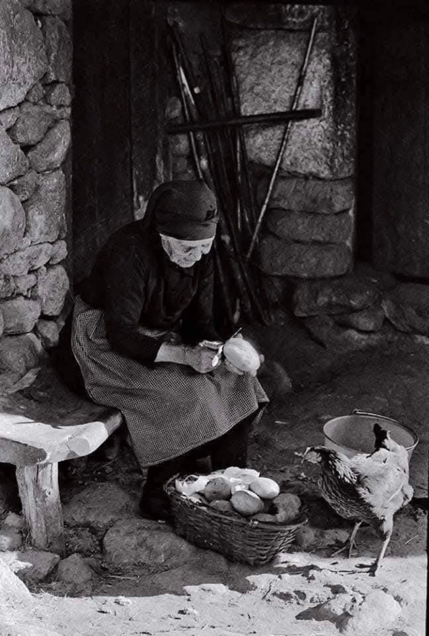 «esmundando» o pelando patatas en el «poyo» del corral. Año 1970