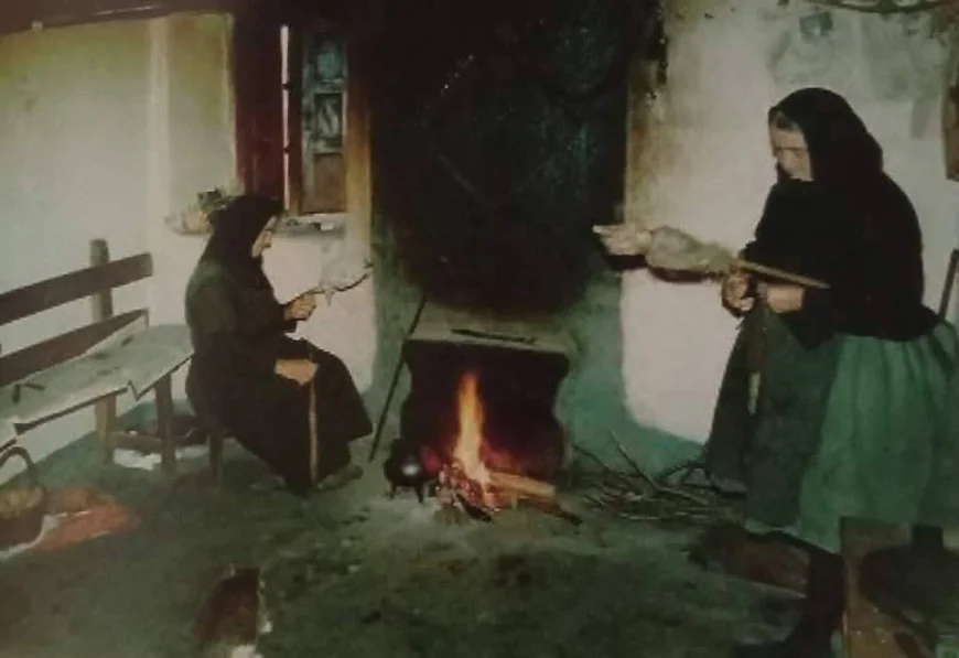 Mujeres con pañuelo negro hilando en la cocina. Las hermanas Ignacia (†), sentada en la banca hilando lana y de pié Estefanía (†) hilando lino. Fotografía del libro «Riofrío de Aliste» de Gregorio Rodríguez Fernández