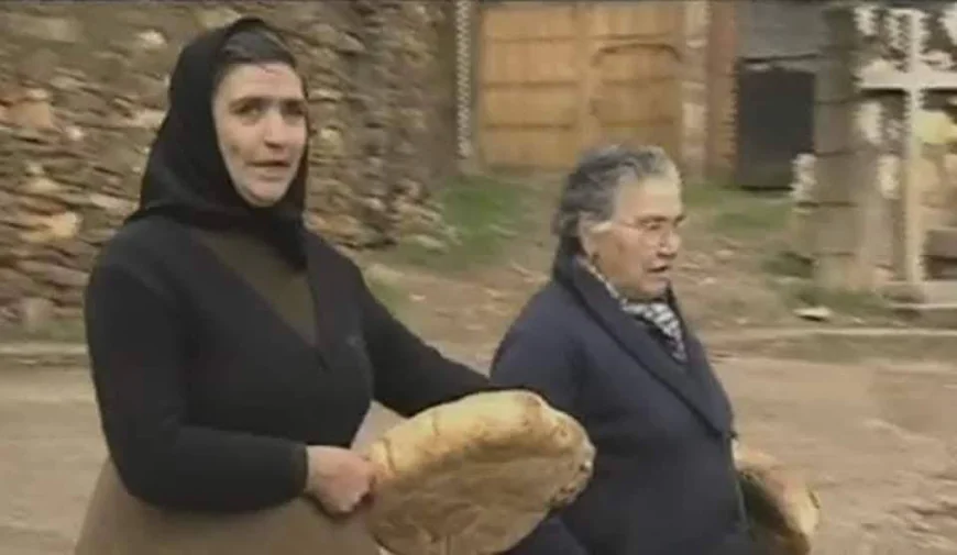 Lucía Andrés (†), sin pañuelo y Mercedes Gallego (†) con pañuelo y la «guaza» u hogaza de pan. Riofrío de Aliste años 80