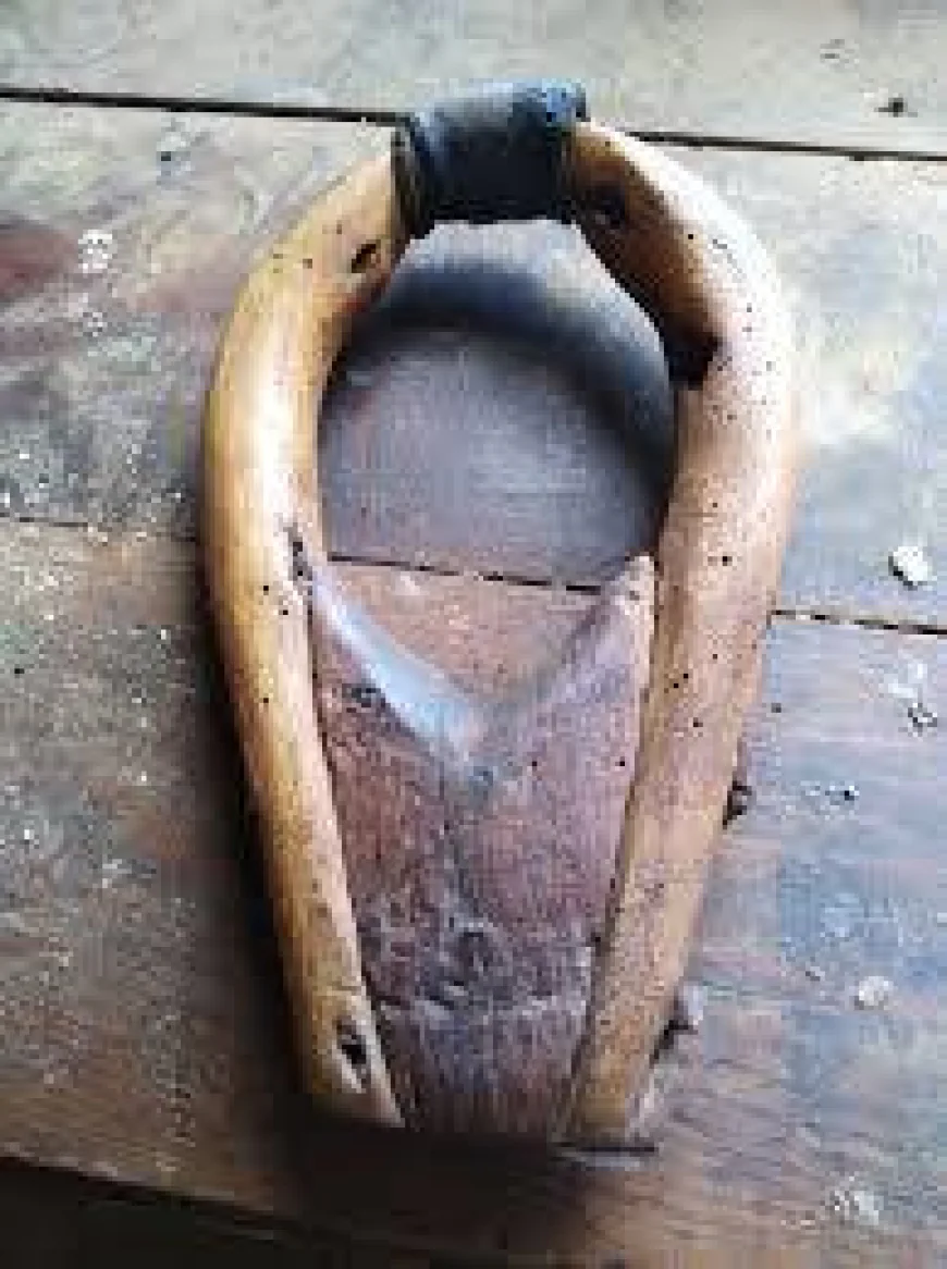En el centro del yugo pendía «la trasga», este útil o aparejo era de madera, hecha en dos piezas en forma de U invertida y cerrada por la parte de abajo más estrecha.