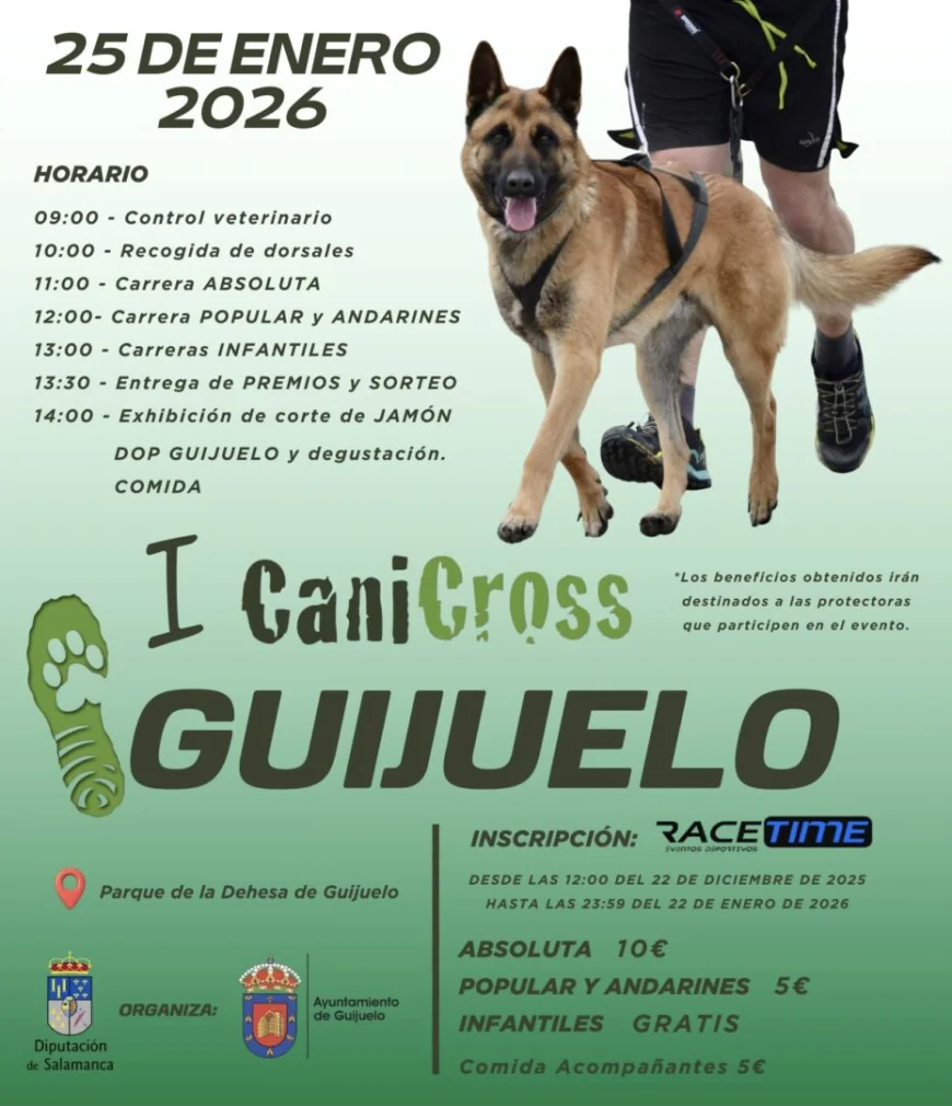 El Ayuntamiento de Guijuelo ha anunciado la celebración del primer canicross en la localidad chacinera. Tendrá lugar el domingo 25 de enero, en el Parque de la Dehesa. Las inscripciones podrán hacerse a partir de este lunes 22 de diciembre a las 12:00h y se prolongarán hasta las 23:59h del 22 de enero, a través de Racetime.