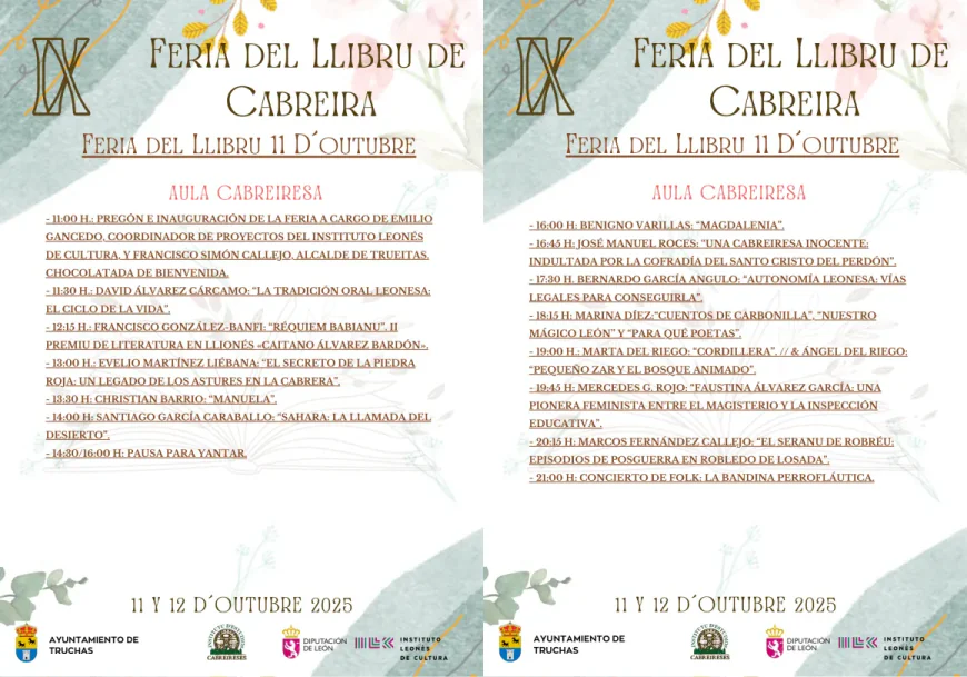 La IX Feria´l Llibru de Cabreira va facese los días 11 y 12 d’ochobre en Trueitas, nuna situación marcada polos fueos que queimaron gran cachu la comarca. L’organización, formada pol Institutu d’Estudios Cabreireses y l’Ayuntamientu Trueitas, decidió atrasare l’autu pa garantizare un ambiente más seguru y prestosu, y dai a la xente cabreiresa un sitiu pa deprendere y recuperare.