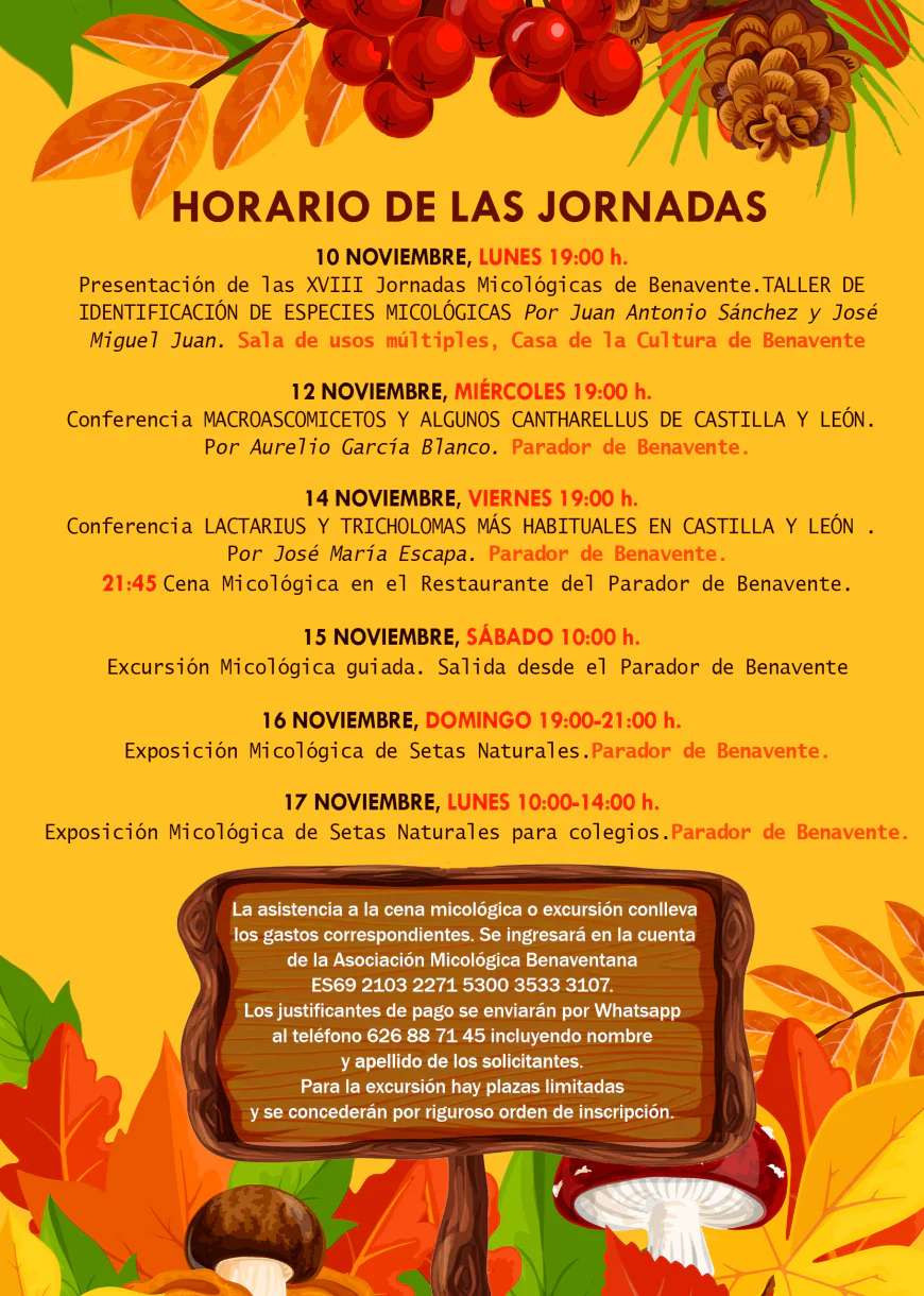 La Concejalía de Medio Ambiente del Ayuntamiento de Benavente ha presentado la 18ª edición de las Jornadas Micológicas, que se celebrarán del 10 al 17 de noviembre. Esta cita anual busca acercar el mundo de los hongos al público general, coincidiendo con la temporada ideal para las salidas al campo en busca de setas.